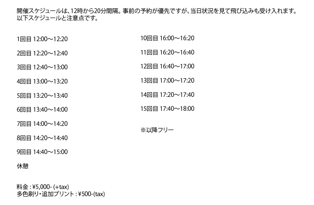 今週から予約もスタート致します。シルクスクリーンのワークショップは毎回大好評ですので、ご興味を持ちの方は是非体験してみてください。勿論、見学も大歓迎です。