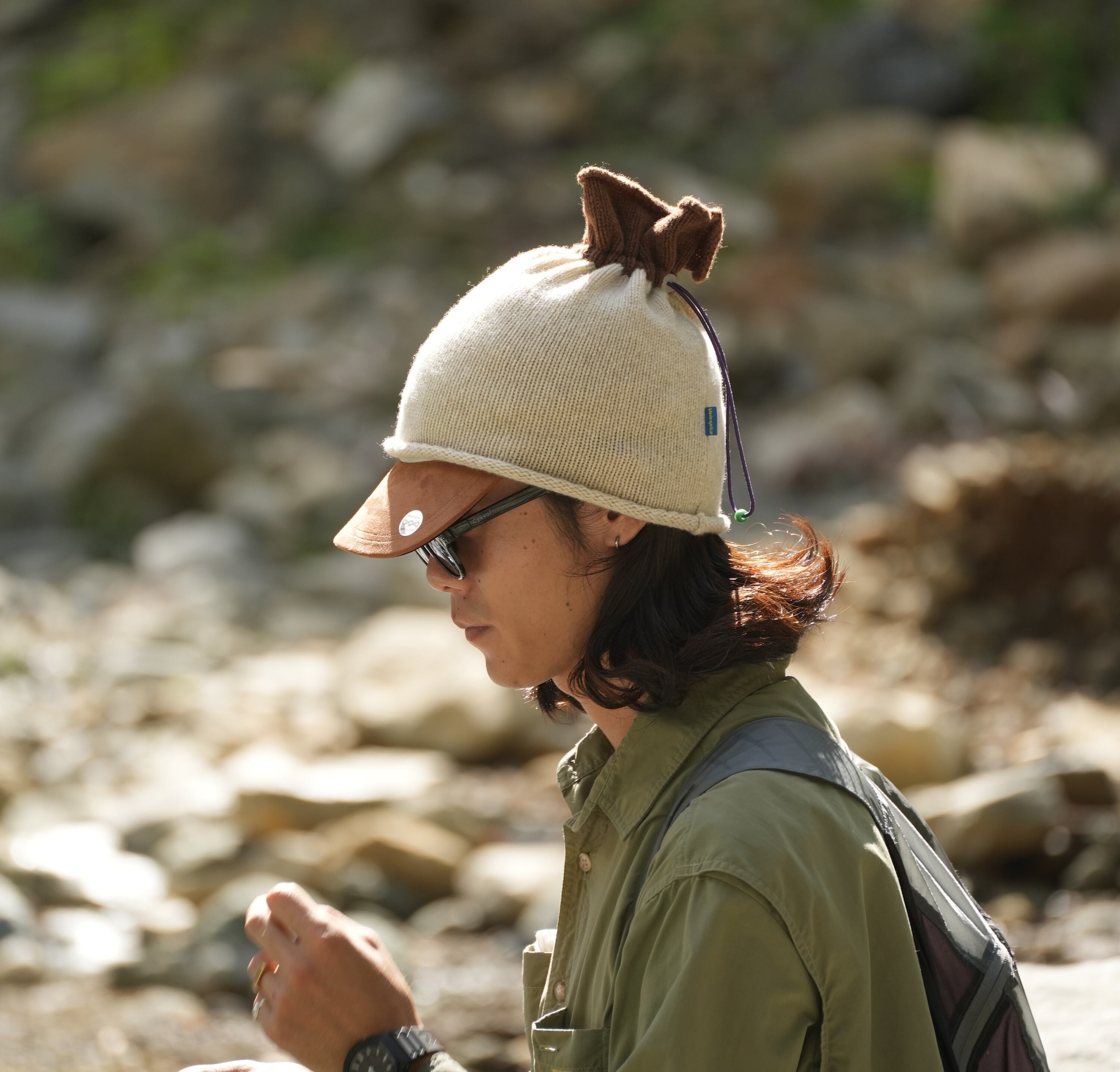 また端がロールしており、巻き込んで深さを変えたり、上部コードアジャスターを調整することで様々な被り方が出来ます。アジャスターを緩めてベンチレーションとして機能させることも。写真のようにキャップの上からの着用も可能です。