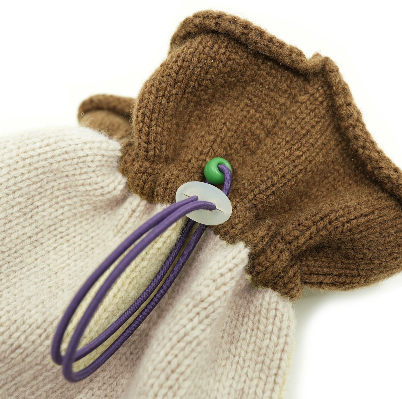 普通にかぶっても、トップのフリルとコードが特徴的で良い感じです。それでいて深さを調整出来るので帽子の上からでも被れたりする。軽くて暖かく、なおかつオーバーヒートした時には、帽子上部にベンチレーションも作れる、、、